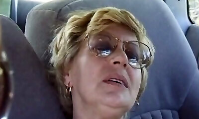 Mature Pauline thumbs her old pussy in a car and gets fucked