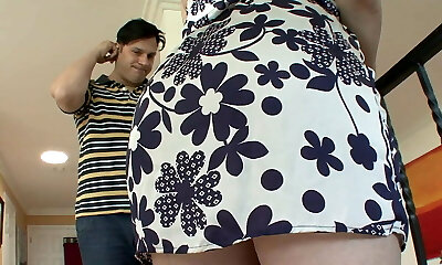 Mature, French black-haired with glasses is wearing black stockings while making her first porn video