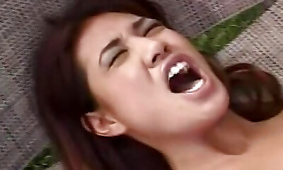 After satisfying her boyfriend the busty Asian lets his boss play with her taut coochie