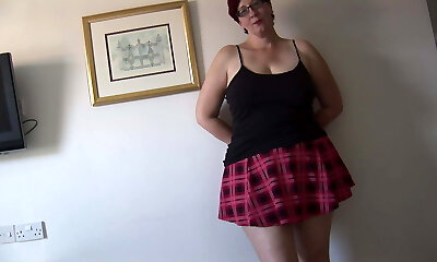 активная зрелая толстушки в мини-мини-юбке рвет свои колготки и растягивается