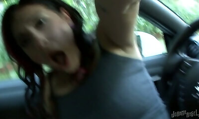 Kinky brunette nympho with monstrous nose fingers her soddening cunt in the car