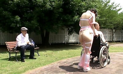 Subtitled bizarre Japanese half naked caregiver outdoors