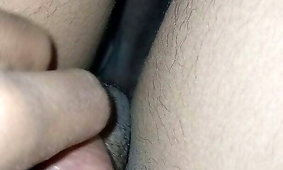 Solo ebony chick with natural tits pleasuring her hairy cunt